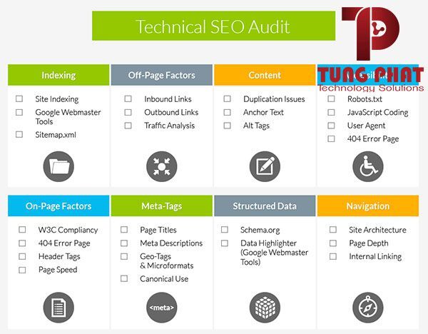 Tất cả nhưng gì liên quan tới code web như robot.txt, sitemap, Tốc độ load, 301, 302, 404....bạn có thể lên google tìm check list nhé.
