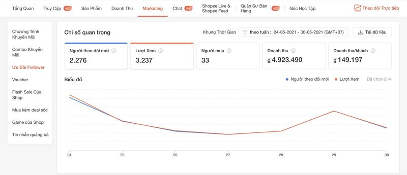 Từ ngày mình cài ưu đãi Follow, số lượt Follow shop mình tăng trưởng hơn rất nhiều, hàng tuần đều đặn có từ 2000-3000 lượt khách hàng mới Follow shop, và từ đây mình có thêm 1 lượng chuyển đổi sang đơn hàng và doanh thu mới.