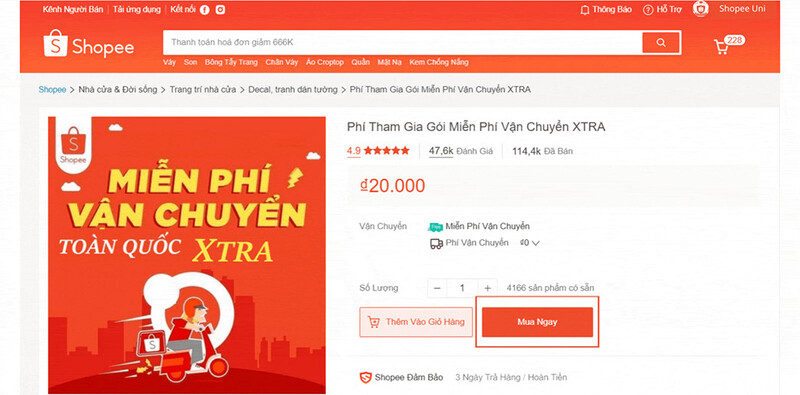 Bước 2: Chọn Mua Ngay để mua 01 Gói Freeship Xtra.