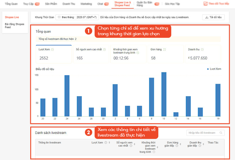 Bạn cũng có thể xem chi tiết hơn hiệu quả của từng buổi livestream trong phần Danh sách Livestream.