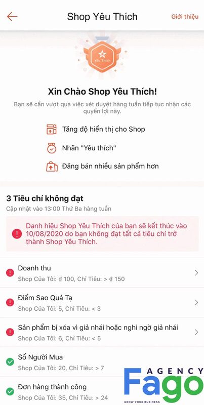 Shop sẽ mất danh hiệu Shop Yêu Thích vào thứ Hai tuần kế tiếp nếu không đảm bảo được bất kỳ 1 trong các điều kiện duy trì Shop Yêu Thích sau: