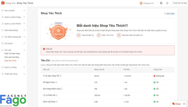 Bạn sẽ mất danh hiệu Shop Yêu Thích nếu không đảm bảo những tiêu chuẩn về hiệu quả hoạt động. Bạn có thể xem ngày kết thúc danh hiệu Shop Yêu Thích của mình trong trang Shop Yêu Thích.