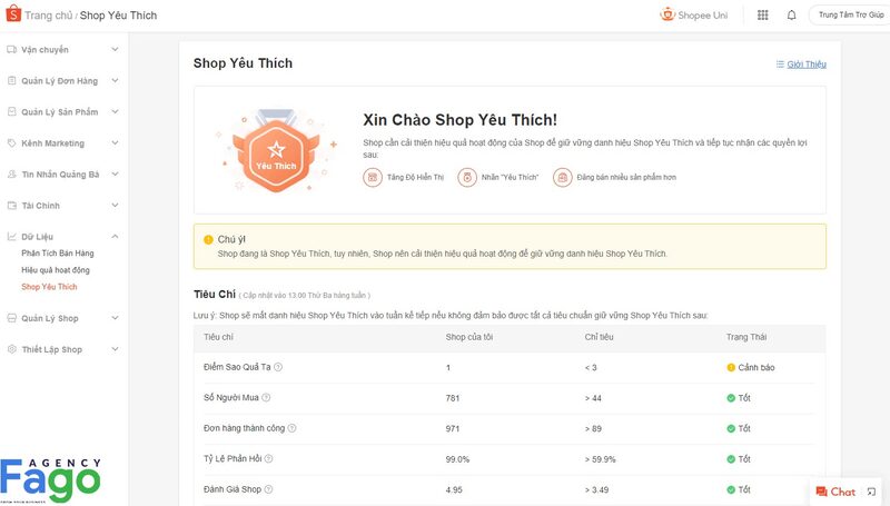 Để giữ vững danh hiệu Shop Yêu Thích, Người bán nên theo dõi chặt chẽ hiệu suất của Shop trên trang Shop Yêu Thích. Người bán cũng nên cải thiện hiệu quả hoạt động của Shop trong trường hợp nhận được cảnh báo từ Shopee.